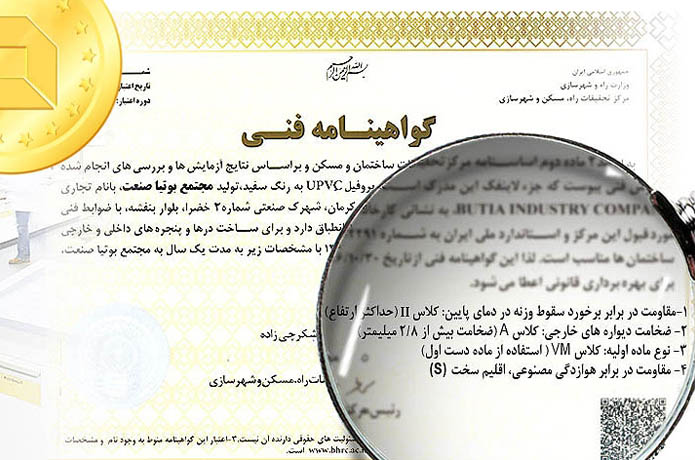مجتمع بوتیا صنعت بعنوان اولین تولید کننده پروفیل در و پنجره یو پی وی سی افتخار دارد که محصولات این شرکت با بالاترین کیفیت و رعایت حداکثر شاخص های استانداردهای مربوط به تولید پروفیل در و پنجره دوجداره یو پی وی سی تولید و در اختیار مصرف کنندگان قرار می گیرد. در صورت موفقیت محصول در گذراندن آزمونهای کیفی این شاخص ها در گواهینامه فنی مرکز تحقیقات راه، مسکن و شهرسازی درج می گردد. مصرف کنندگان محترم میتوانند با مقایسه گواهینامه های فنی صادر شده شرکت های تولید کننده از درجه کیفی محصول اطلاعات کامل تری بدست آورده و با اطمینان خاطر بیشتری نسبت به انتخاب آن اقدام کنند.